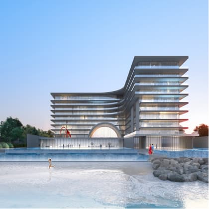 The magnificent elevated entry experience sets the tone, providing residents with extravagant ocean views from a range of angles. Throughout the building, the interplay of light and shadow amplifies a series of stylish design elements, including the overhanging arch and the many water features and pools.