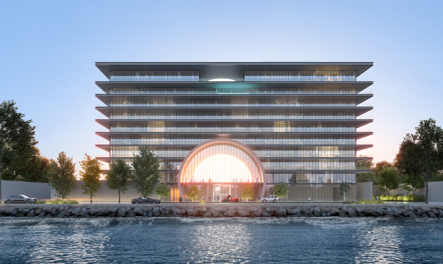 The magnificent elevated entry experience sets the tone, providing residents with extravagant ocean views from a range of angles. Throughout the building, the interplay of light and shadow amplifies a series of stylish design elements, including the overhanging arch and the many water features and pools.